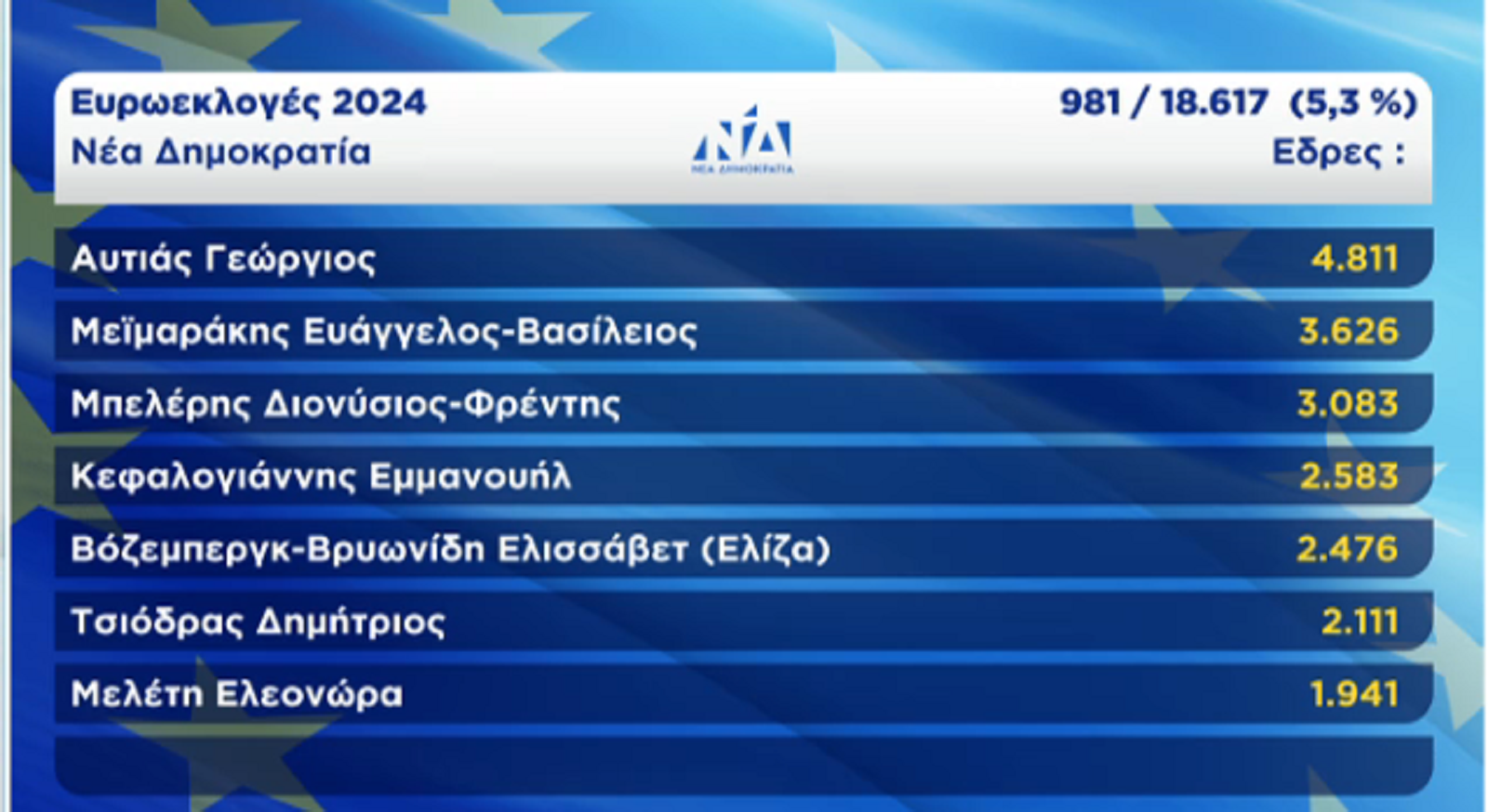 Σύμφωνα τελική εκτίμηση του αποτελέσματος των Ευρωεκλογών 2024 που έδωσε το υπουργείο Εσωτερικών, φαίνεται πρωτιά της ΝΔ με ποσοστό 27,9% ενώ στη “μάχη” του σταυρού στο “γαλάζιο” ευρωψηφοδέλτιο προηγούνται οι εξής: