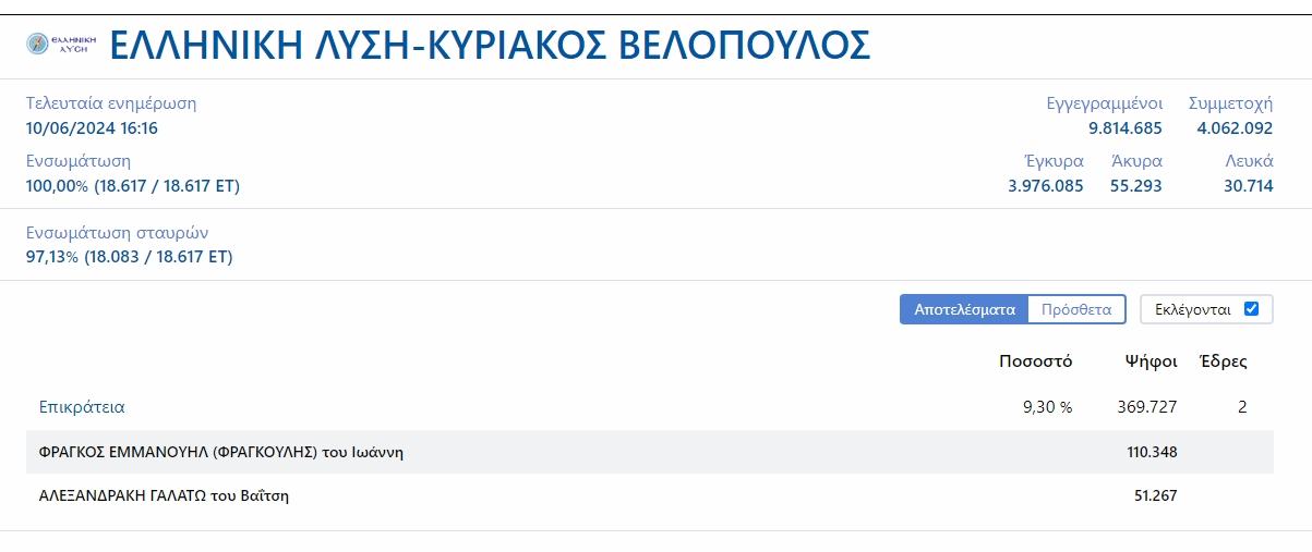 Στις ευρωεκλογές της 9 Ιουνίου 2024, ο Φράγκος (Φραγκούλης) Εμμανουήλ ήρθε πρώτος σε σταυρούς στο ευρωψηφοδέλτιο της Ελληνικής Λύσης.