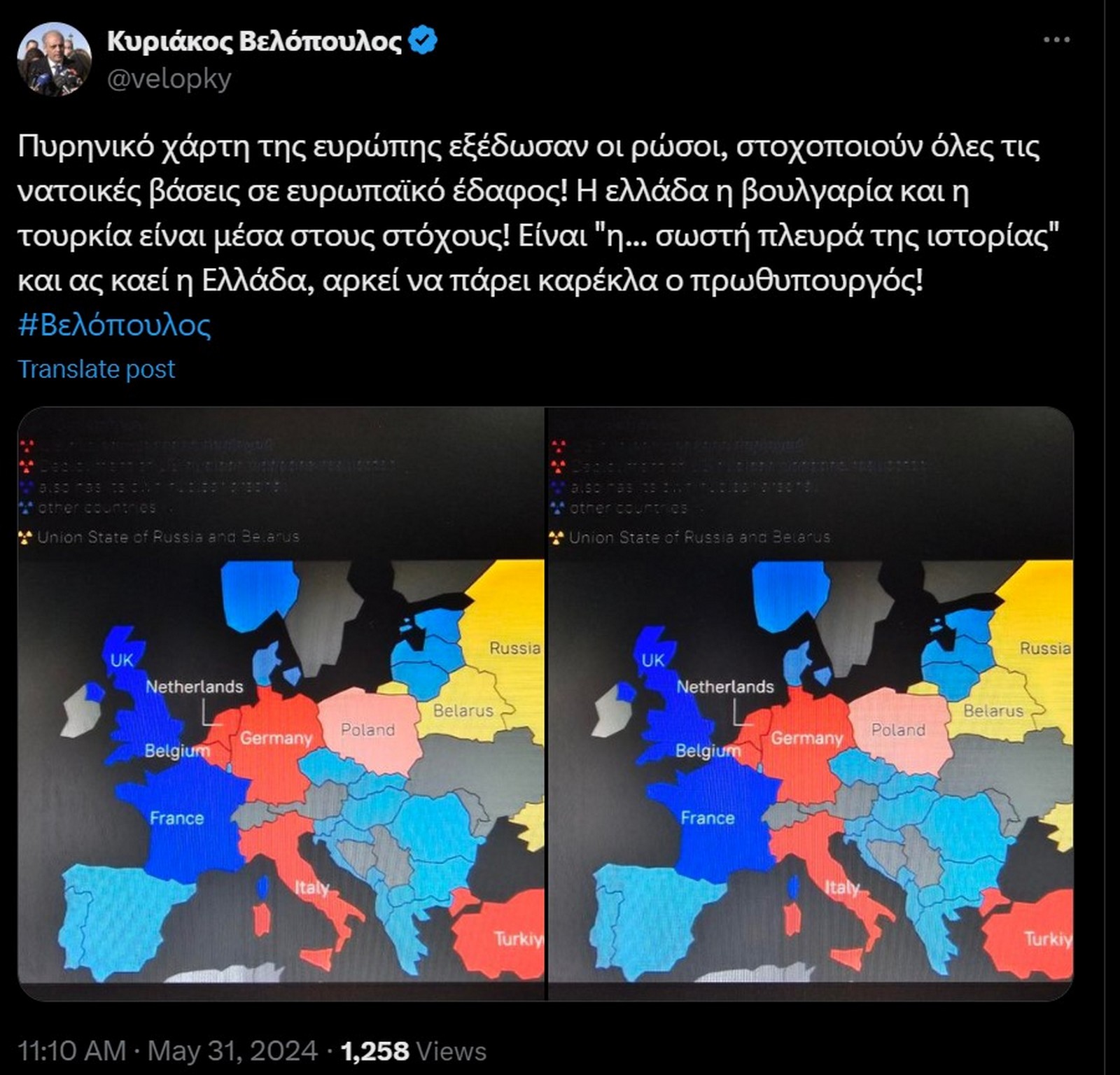 “Τσουνάμι” παραπληροφόρησης στην ΕΕ ενόψει ευρωεκλογών, με τα τελευταία fake news να υποστηρίζουν ότι η Ελλάδα αποτελεί πυρηνικό στόχο για το Κρεμλίνο. Το κοινοποίησε και ο Κυριάκος Βελόπουλος.