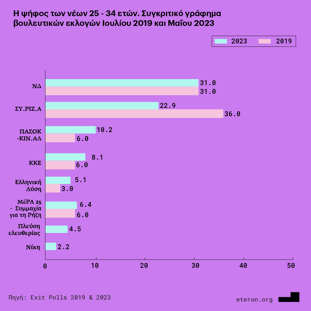 Το παρόν κείμενο δεν έχει τη φιλοδοξία να δώσει συνολικές ερμηνείες των αποτελεσμάτων. Άλλωστε, αν κάτι περισσεύει μετά από αυτά τα εκλογικά συμπεράσματα, αυτό είναι σίγουρα οι βεβαιότητες για τη συμπεριφορά του εκλογικού σώματος. Σε συνέχεια της ερευνητικής δουλειάς για τη νέα γενιά, στόχος του κειμένου αυτού ήταν, αφενός, να παρουσιάσει τα εκλογικά αποτελέσματα μέσα από τη συγκριτική καταγραφή τους με βάση τα exit polls του Ιουλίου του 2019 και του Μαΐου του 2023 και, αφετέρου, να προαναγγείλει το διάλογο που θα φιλοξενήσουμε το επόμενο διάστημα στο σάιτ του Eteron στο πλαίσιο του project “Youth – Voice On”.