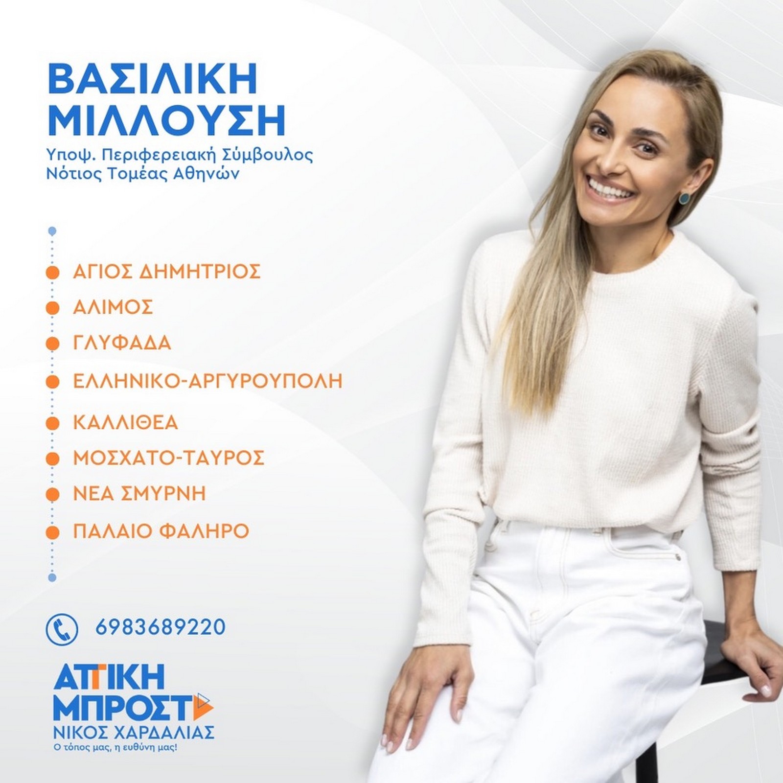 Η Βασιλική Μιλλούση είναι Υποψήφια Περιφερειακή Σύμβουλος στον Νότιο Τομέα με τον συνδυασμό του Νίκου Χαρδαλιά “Αττική Μπροστά”, θέλοντας να δώσει συνέχεια στην πολυεπίπεδη δράση της, η οποία έχει επίσης επισφραγιστεί από τη θέση της Προέδρου της Επιτροπής Αθλητών (από το 2016 μέχρι το 2021) και -μέχρι σήμερα- της Επιτροπής Ισότητας της ΕΟΕ.