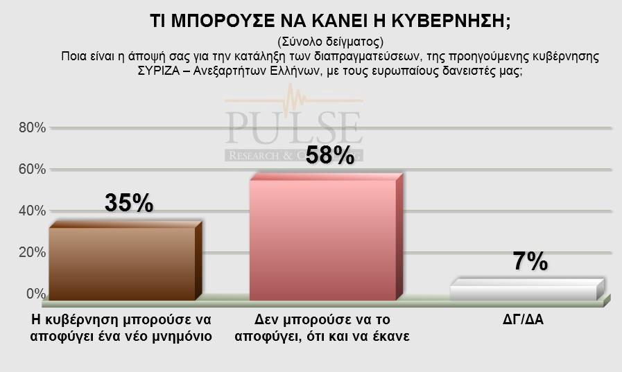 «Δεν μπορούσε να αποφύγει το μνημόνιο, ό,τι και να έκανε η ελληνική κυβέρνηση» επιλέγουν οι περισσότεροι (58%) ερωτηθέντες.