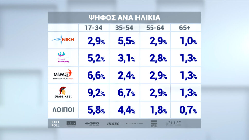 Ανησυχία προκαλεί το υψηλό ποσοστό 9,2% που σημείωσε το ακροδεξιό κόμμα "Σπαρτιάτες" στους νέους 17-34 ετών. Απόλυτη νίκη της ΝΔ στους κεντρώους, δεύτερο το ΠΑΣΟΚ.