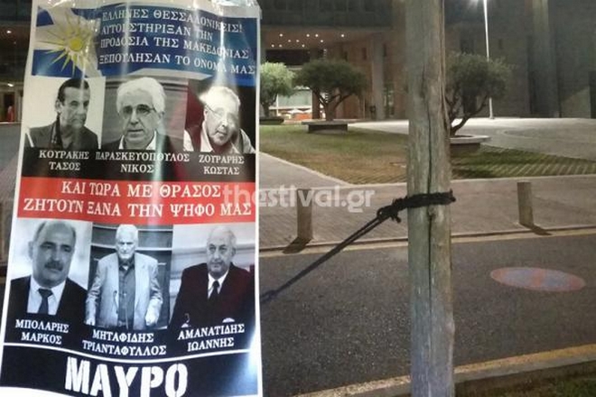 Στο μήνυμα της αφίσας αναφέρεται: «Έλληνες Θεσσαλονικείς! Αυτοί στήριξαν την προδοσία της Μακεδονίας. Ξεπούλησαν το όνομά μας και τώρα με θράσος ζητούν ξανά την ψήφο μας. Μαύρο».