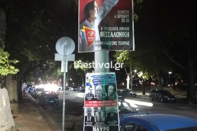 Αφίσες, με τις οποίες καλούν τους Θεσσαλονικείς να «μαυρίσουν» υποψήφιους βουλευτές του ΣΥΡΙΖΑ στις εκλογές της 7ης Ιουλίου, τοιχοκόλλησαν άγνωστοι στο κέντρο της πόλης.