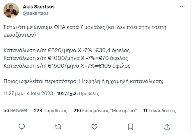 Χθες βράδυ ο κ. Σκέρτσος, πρώην σύμβουλος του ΣΕΒ, με μια ανάρτηση μνημείο μαθηματικής αλχημείας, προσπάθησε να μας πείσει ότι η μείωση του ΦΠΑ στα τρόφιμα, θα ευνοήσει τα υψηλότερα εισοδήματα. Και ως γνωστόν, η ΝΔ ανατριχιάζει στην ιδέα να ευνοήσει τους πλούσιους, αλίμονο …