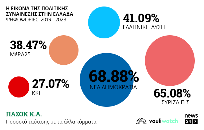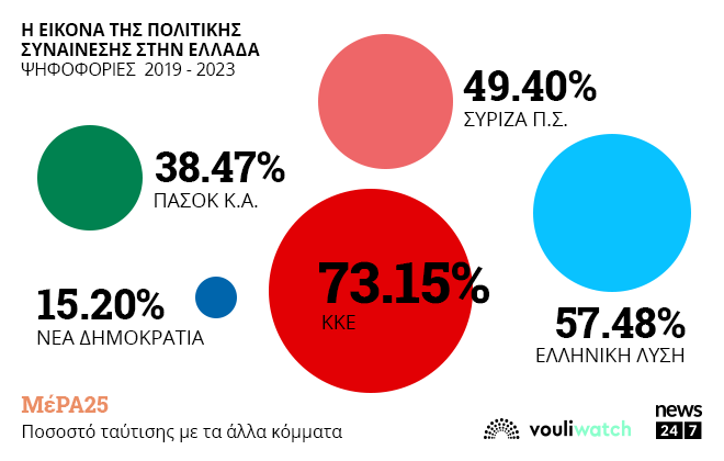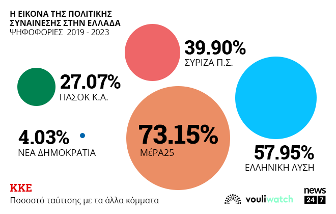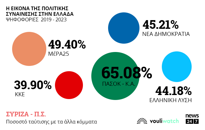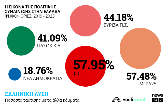 Στον αντίποδα, η Ελληνική Λύση του Κυριάκου Βελόπουλου έχει το υψηλότερο ποσοστό σύμπλευσης με την Ν.Δ. που φτάνει το 18,76%. Επίσης καταγράφεται υψηλή ταύτιση ανάμεσα στο ΚΚΕ και το ΜέΡΑ25 που φθάνει το 73,15% Πρόκειται για το υψηλότερο ποσοστό ταύτισης κομμάτων γενικώς μέσα στην τελευταία 4ετία. Αντίστοιχα, οι ταυτίσεις του ΜέΡΑ25 με τον ΣΥΡΙΖΑ είναι στο 49,4% ενώ με το ΠΑΣΟΚ στο 38,47%.