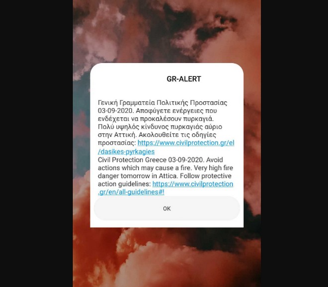 Μήνυμα στους κατοίκους της Αττικής εστάλη το απόγευμα της Πέμπτης (03/09) από το 112, εφιστώντας τους την προσοχή στον μεγάλο κίνδυνο για εκδήλωση φωτιάς που υπάρχει για την Παρασκευή (04/09) στο λεκανοπέδιο.