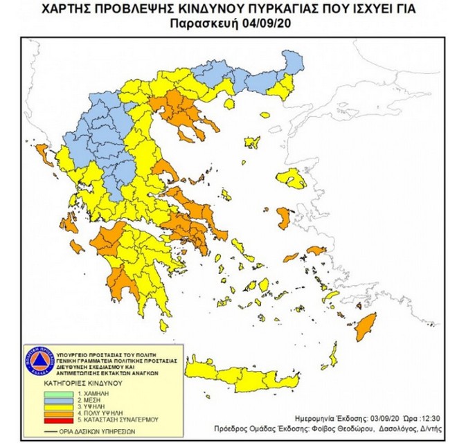 Υπενθυμίζεται, ότι σύμφωνα με τον χάρτη πρόβλεψης κινδύνου πυρκαγιάς που εκδίδει η Γενική Γραμματεία Πολιτικής Προστασίας, για την Παρασκευή προβλέπεται πολύ υψηλός κίνδυνος πυρκαγιάς (κατηγορία κινδύνου 4) στις εξής περιφέρειες: Αττικής, Στερεάς Ελλάδας (ΠΕ Εύβοιας, ΠΕ Βοιωτίας), Δυτικής Ελλάδας (ΠΕ Αχαΐας, ΠΕ Ηλείας), Ιονίων Νήσων (ΠΕ Κέρκυρας, ΠΕ Κεφαλονιάς, ΠΕ Ζακύνθου), Πελοποννήσου (ΠΕ Μεσσηνίας), Θεσσαλίας (ΠΕ Μαγνησίας, ΠΕ Σποράδων), Κεντρικής Μακεδονίας (ΠΕ Θεσσαλονίκης, ΠΕ Χαλκιδικής), Βορείου Αιγαίου (ΠΕ Χίου, ΠΕ Σάμου, ΠΕ Ικαρίας) και Νοτίου Αιγαίου (ΠΕ Ρόδου).