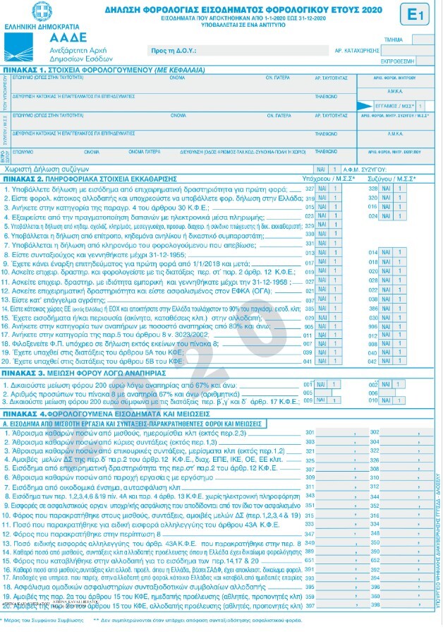 Το νέο έντυπο Ε1 για το φορολογικό έτος 2020 είναι το εξής: