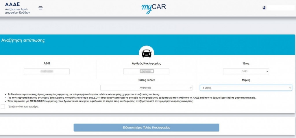 ΑΑΔΕ: Άνοιξε η πλατφόρμα myCAR για την πληρωμή τελών κυκλοφορίας με τον μήνα