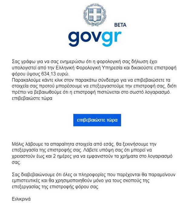 Συγκεκριμένα, το ψευδές μήνυμα γράφει, «σας γράφω για να σας ενημερώσω ότι η φορολογική σας δήλωση έχει υπολογιστεί από την Ελληνική φορολογική Υπηρεσία και δικαιούστε επιστροφή φόρου ύψους 634,13 ευρώ» και καλεί τον ανυποψίαστο πολίτη να πατήσει λινκ έτσι ώστε “να επιβεβαιώσει τα στοιχεία του”.