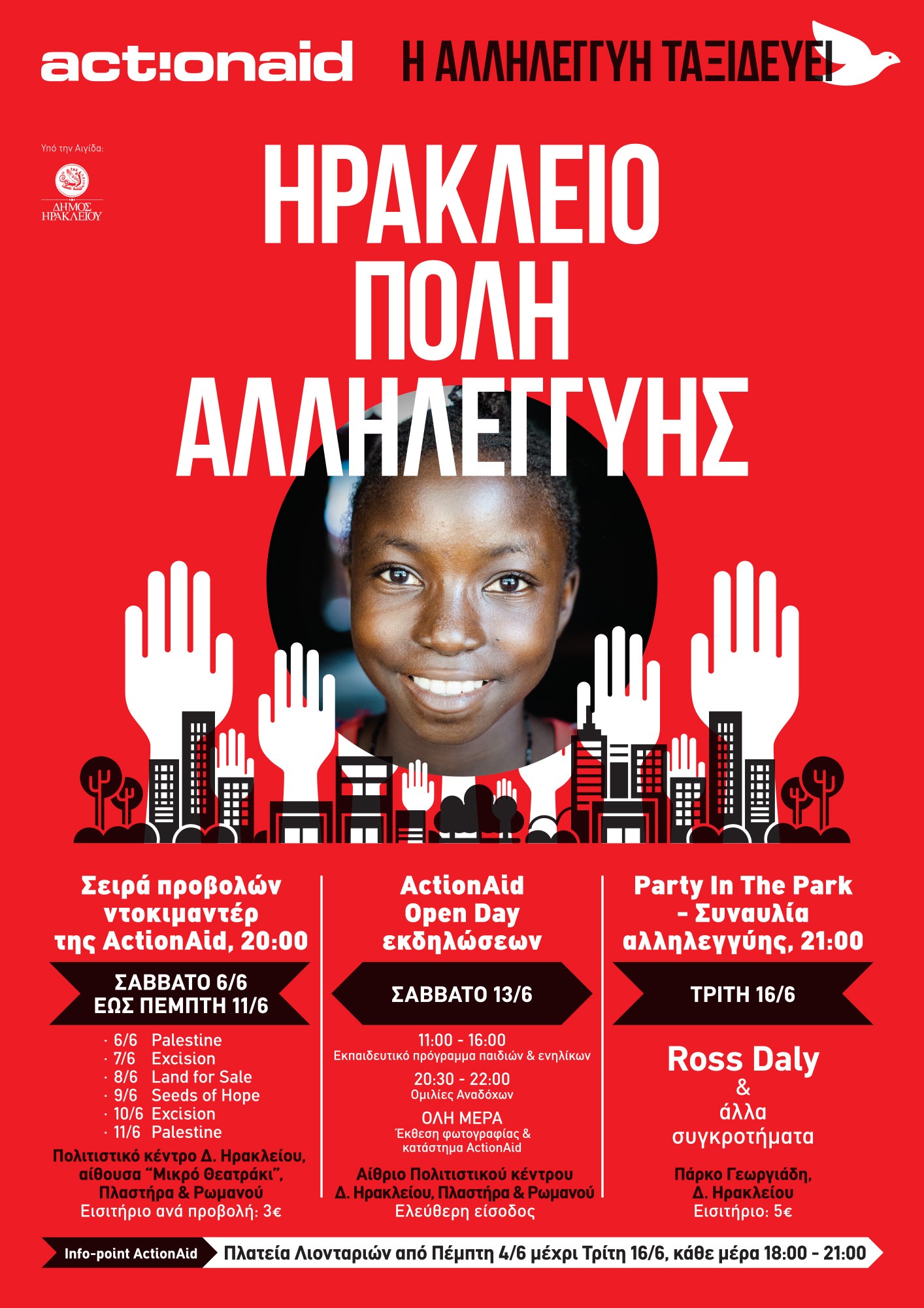 Σάββατο 13/6: ανοιχτή ημέρα με εκδηλώσεις: 11.00 πμ με 4.00 μμ: Βιωματικά εργαστήρια για παιδιά και ενήλικες για τα ανθρώπινα δικαιώματα από την εκπαιδευτική ομάδα της ActionAid. 8.30 μμ με 10.00: Ομιλίες Αναδόχων από το Ηράκλειο που έχουν ταξιδέψει με την ActionAid και θα μεταφέρουν τις εμπειρίες τους για το πώς μπορείς να βρεις την ελπίδα ακόμα κι όταν ζεις στην ακραία φτώχεια. Επίσης, όλη την ημέρα, οι επισκέπτες θα μπορούν να δουν την έκθεση φωτογραφίας και να αγοράσουν πρωτότυπα αντικείμενα από όλον τον κόσμο από το κατάστημα της ActionAid. Οι εκδηλώσεις θα πραγματοποιηθούν στο αίθριο του Πολιτιστικού Κέντρου του Δήμου Ηρακλείου, Πλαστήρα και Ρωμανού. Είσοδος: ελεύθερη.