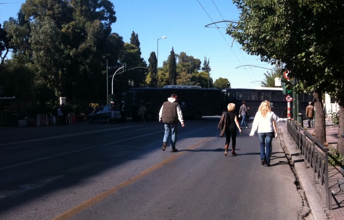 Αποκλεισμένη με όχημα της ΕΛ.ΑΣ. είναι η Ηρώδου Αττικού, ενώ ισχυρή είναι η παρουσία αστυνομικών κατά μήκος της Πανεπιστημίου μέχρι τα Προπύλαια.
