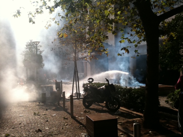 16:02: Κουκολοφόροι εξακολουθούν να πετούν πέτρες και ξύλα στις δυνάμεις των ΜΑΤ και στήνουν πύρινα οδοφράγματα. Αποπνικτική η ατμόσφαιρα, λόγω χρήσης χημικών από την αστυνομία.