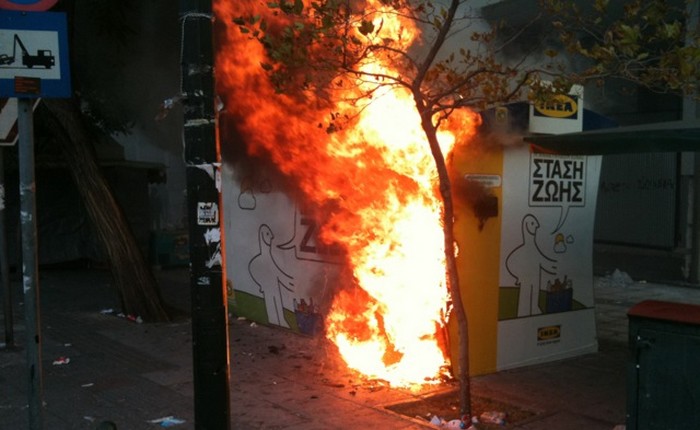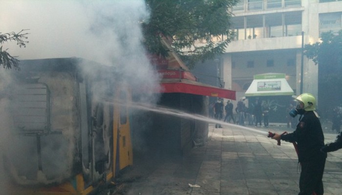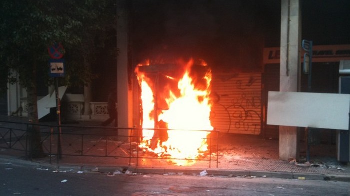 17:29: Φωτιές σε κιόσκι λεωφορείων στη Φιλελλήνων. Πολλοί διαδηλωτές αποχωρούν, καθώς συνεχίζεται ο κλεφτοπόλεμος μεταξύ αντιεξουσιαστών και ΜΑΤ.