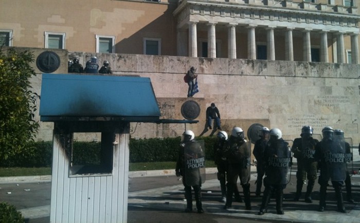 Ηρέμησε η κατάσταση στους δρόμους γύρω από τη Βουλή. Μεγάλη επιχείρηση της αστυνομίας. Απωθήθηκαν διαδηλωτές και κουκουλοφόροι. Κλοπή όπλου από ειδικό φρουρό. Πυρκαγιά σε καφετέρια. Φωτιά στο φυλάκιο των Ευζώνων. Εκτεταμένες καταστροφές ΣΥΝΕΧΗΣ ΕΝΗΜΕΡΩΣΗ (Vιds+Pics)