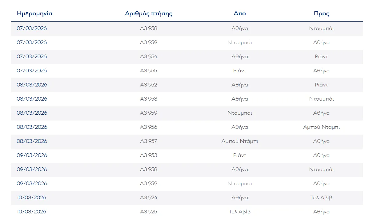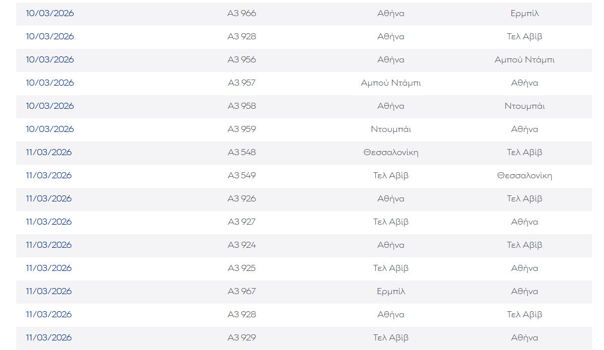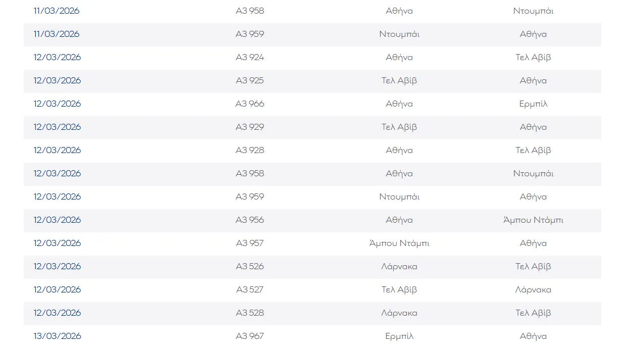 • Οι πτήσεις από και προς το Ντουμπάι και το Αμπού Ντάμπι ακυρώνονται έως τις βραδινές ώρες της 12ης Μαρτίου 2026