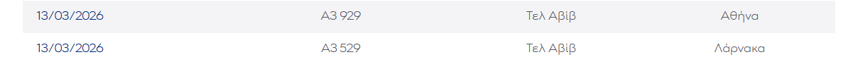 • Οι πτήσεις από και προς το Τελ Αβίβ, τη Βηρυτό, το Ερμπίλ και τη Βαγδάτη ακυρώνονται έως τις πρώτες πρωινές ώρες της 13ης Μαρτίου 2026