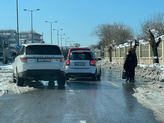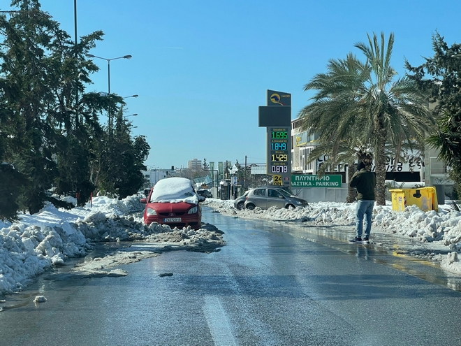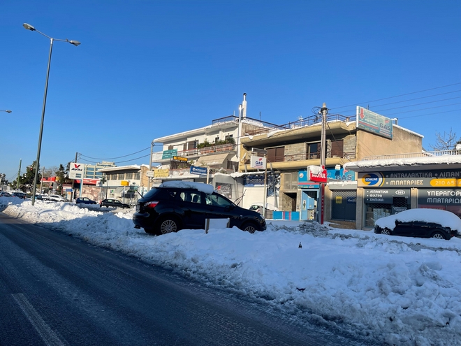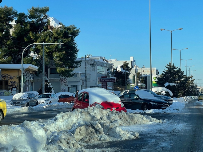 Ειδικά από το ύψος του νοσοκομείου Σωτηρία μέχρι την έξοδο για Παλλήνη οι δρόμοι έχουν μεν δοθεί στην κυκλοφορία ωστόσο τα οχήματα (ανάμεσα τους και πολλά λεωφορεία) είναι ακόμη εγκλωβισμένα και θαμμένα στο χιόνι.