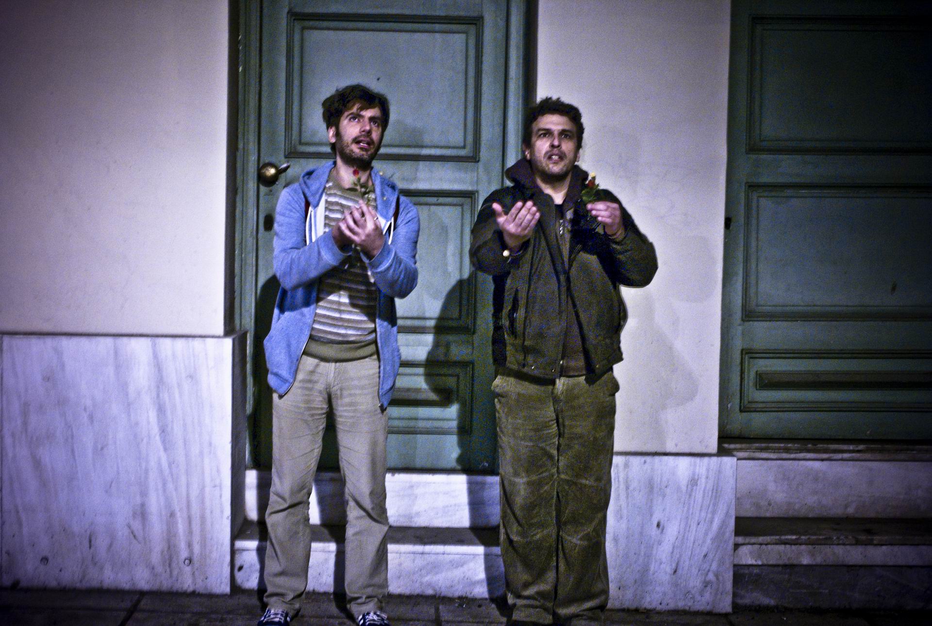 Ο Βασίλης Νούλας και ο Κώστας Κουτσολέλος, από την Κίνηση Μαβίλη, εξηγούν γιατί το να γελάς δημοσίως με τα λεγόμενα του Υπουργού είναι πολιτική πράξη. Φωτογραφίες: Άγγελος Χριστοφιλόπουλος/ FOSPHOTOS