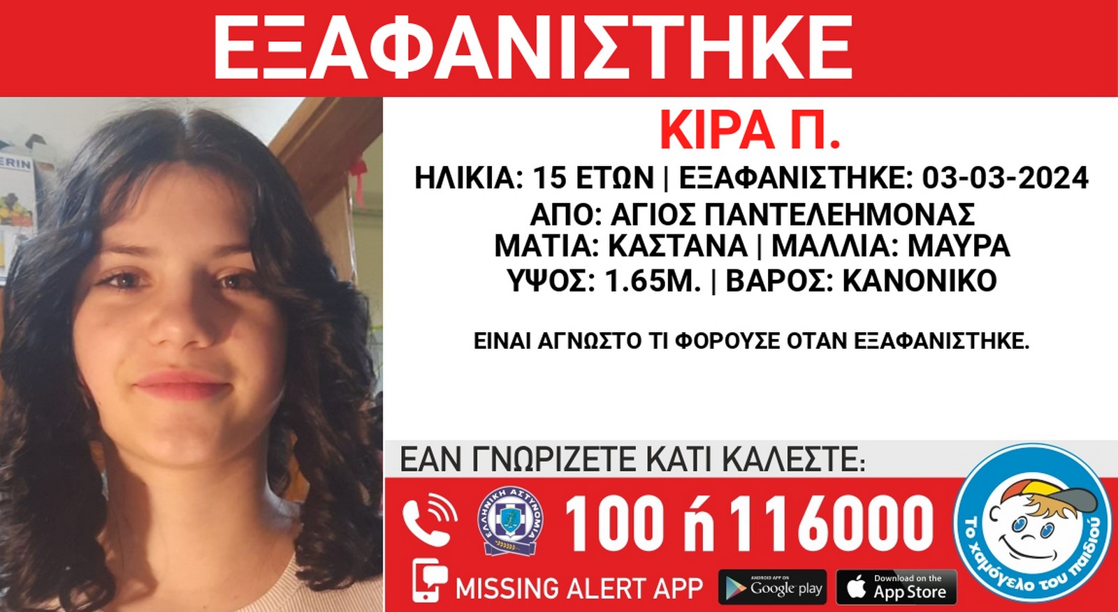 Το «Χαμόγελο του Παιδιού» ενημερώθηκε για την εξαφάνιση της ανήλικης και προχώρησε στη δημοσιοποίηση των στοιχείων της, κατόπιν αιτήματος της οικογένειας της, καθώς συντρέχουν σοβαροί λόγοι που θέτουν τη ζωή της σε κίνδυνο.