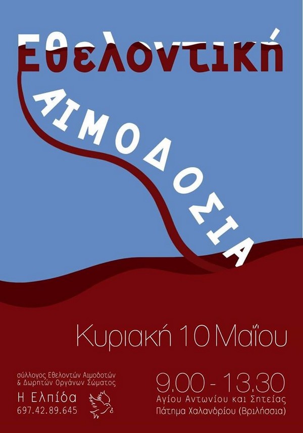 Ο Ιερός Ναός Αγίου Αντωνίου και ο Σύλλογος Εθελοντών Αιμοδοτών ΄΄Η ΕΛΠΙΔΑ΄΄ διοργανώνουν Εθελοντική Αιμοδοσία την Κυριακή 10 Μαϊου και ώρα από 9.30 π.μ. έως τις 13.30 μ.μ. στην Αίθουσα του Πνευματικού κέντρου του Ιερού Ναού Αγίου Αντωνίου στην οδό Αγ. Αντωνίου και Σητείας (Πάτημα Χαλανδρίου-Βριλήσσια) και σε προσκαλεί να συμμετάσχεις σε μια ανιδιοτελή πράξη προσφοράς.