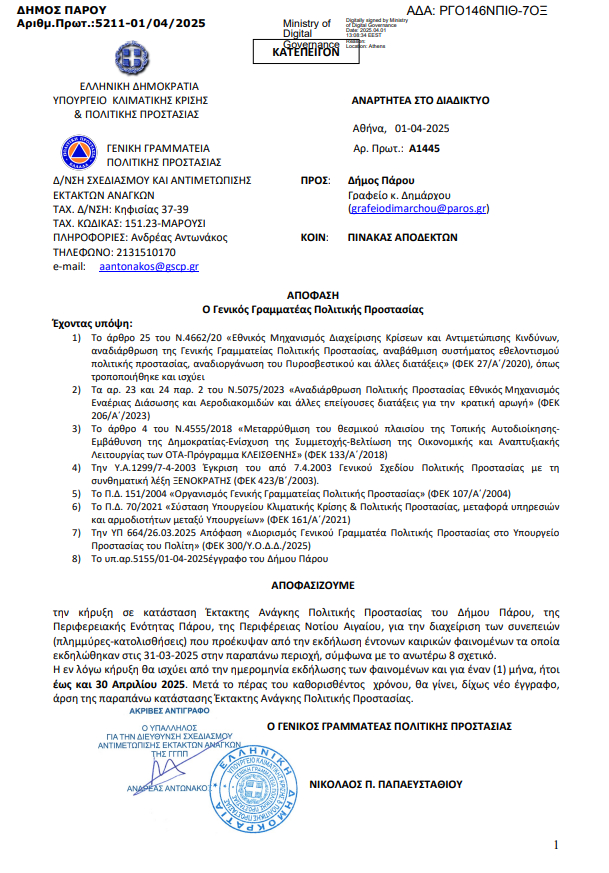 «Αποφασίζουμε την κήρυξη σε κατάσταση Έκτακτης Ανάγκης Πολιτικής Προστασίας του Δήμου Πάρου, της Περιφερειακής Ενότητας Πάρου, της Περιφέρειας Νοτίου Αιγαίου, για την διαχείριση των συνεπειών (πλημμύρες-κατολισθήσεις) που προέκυψαν από την εκδήλωση έντονων καιρικών φαινομένων τα οποία εκδηλώθηκαν στις 31-03-2025 στην παραπάνω περιοχή, σύμφωνα με το ανωτέρω 8 σχετικό.