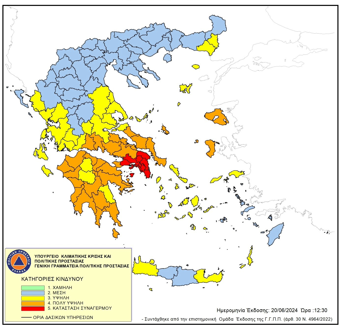 Σύμφωνα με τον χάρτη πρόβλεψης που έδωσε στη δημοσιότητα η Γενική Γραμματεία Πολιτικής Προστασίας του Υπουργείου Κλιματικής Κρίσης & Πολιτικής Προστασίας (civilprotection.gov.gr), την Παρασκευή υπάρχει ακραίος κίνδυνος πυρκαγιάς για την Αττική, κάτι που συμβαίνει για πρώτη φορά φέτος.