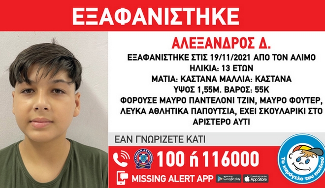 Τα ίχνη ενός 13χρονου χάθηκαν το απόγευμα της 19ης Νοεμβρίου από την περιοχή του Αλίμου. Πρόκειται για τον Αλέξανδρο Δ. και «το Χαμόγελο του Παιδιού» ενημερώθηκε για την εξαφάνιση του ανήλικου στις 5/12 και προέβη, στη δημοσιοποίηση των στοιχείων του κατόπιν Εισαγγελικής Εντολής στις 6/12, καθώς ενδέχεται να συντρέχουν λόγοι οι οποίοι θέτουν την ζωή του σε κίνδυνο.