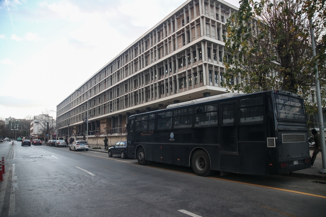 Στο σημείο βρίσκονταν ισχυρές αστυνομικές δυνάμεις, ενώ διμοιρίες της ομάδας ΟΠΚΕ βρίσκονταν στην πίσω πόρτα του κτιρίου, από όπου αποχώρησαν οι κατηγορούμενοι.