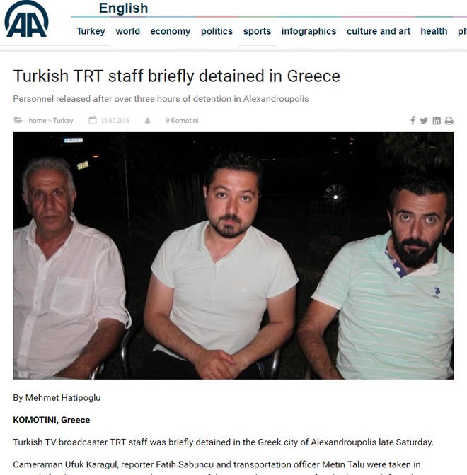 Την είδηση της “σύλληψης” τριών μελών τηλεοπτικού συνεργείου του τουρκικού σταθμού TRT στην Αλεξανδρούπολη, όπου και πραγματοποιούσαν γυρίσματα για την επέτειο των δύο χρόνων από την απόπειρα πραξικοπήματος στην Τουρκία, μεταδίδει τις τελευταίες ώρες το τουρκικό πρακτορείο ειδήσεων Anadolu.