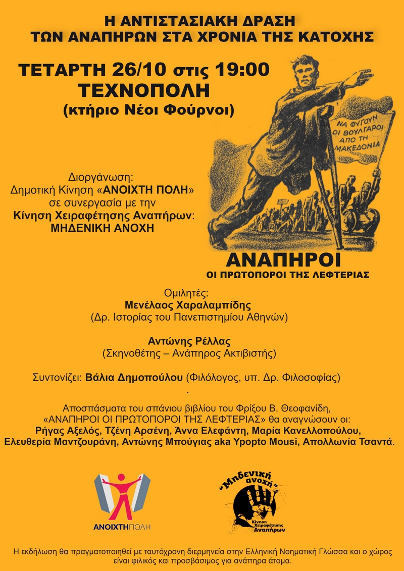 Η εκδήλωση «Η ΑΝΤΙΣΤΑΣΙΑΚΗ ΔΡΑΣΗ ΤΩΝ ΑΝΑΠΗΡΩΝ ΣΤΑ ΧΡΟΝΙΑ ΤΗΣ ΚΑΤΟΧΗΣ» που γίνεται με αφορμή την επέτειο της 28ης Οκτωβρίου διοργανώνεται από την Δημοτική Κίνηση «ΑΝΟΙΧΤΗ ΠΟΛΗ» σε συνεργασία με την Κίνηση Χειραφέτησης Αναπήρων: ΜΗΔΕΝΙΚΗ ΑΝΟΧΗ.