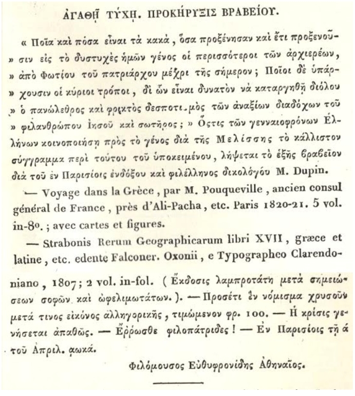 Το 1821, το έτος που έχουμε συνδέσει με την έναρξη της επανάστασης, ένα ελληνικό διαφωτιστικό περιοδικό προκήρυσσε έναν διαγωνισμό στο Παρίσι ακριβώς για αυτά τα θέματα. Συγκεκριμένα, το θέμα όπως το έθετε το περιοδικό “Μέλισσα”, ήταν το εξής: