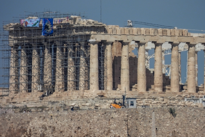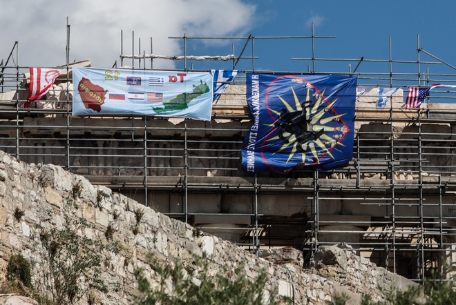 Άγνωστος άνδρας ανέβηκε σε μια σκαλωσιά στον Παρθενώνα και κρέμασε πάνω του σημαίες. Η αστυνομία έστειλε διαπραγματευτή για να τον πείσει να κατέβει.