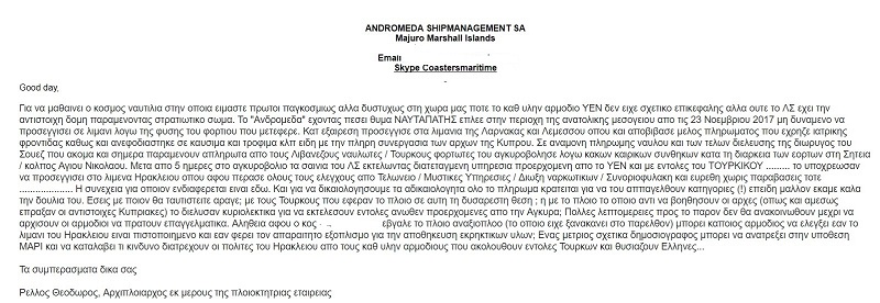 Τι καταγγέλλει ο διαχειριστής της πλοιοκτήτριας εταιρίας του ΑΝΔΡΟΜΕΔΑ σε επιστολή που δημοσιεύει τοπικό μέσο της Κρήτης. Πέρασε από Λεμεσό, Λάρνακα και Σητεία πριν καταλήξει στο λιμάνι του Ηρακλείου