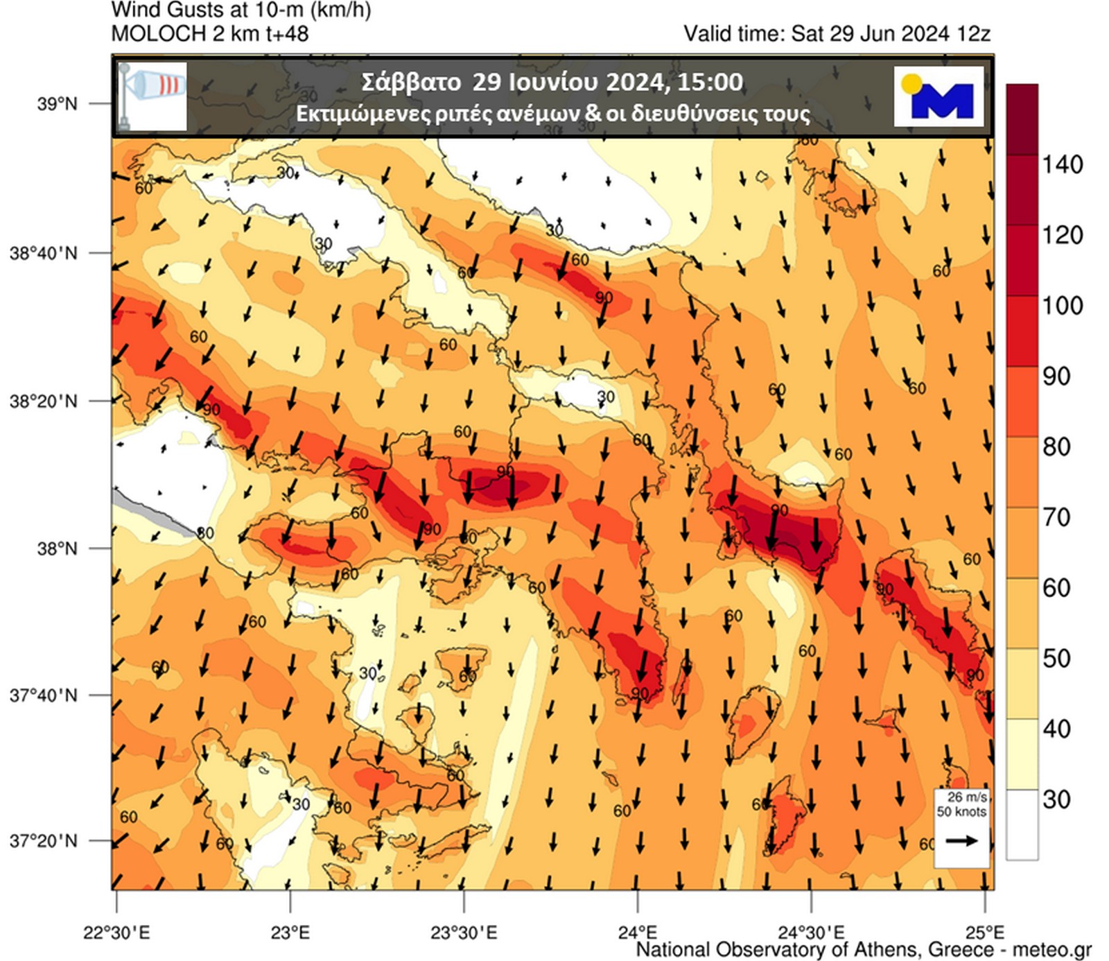 Δείτε χάρτη επικινδυνότητας πυρκαγιάς του Εθνικού Αστεροσκοπείου Αθηνών/Meteo.gr. Με πορτοκαλί αποχρώσεις σημειώνονται οι εκτιμώμενες μέγιστες ριπές των ανέμων και με μαύρα βελάκια οι διευθύνσεις τους, για τις μεσημεριανές ώρες του Σαββάτου 29/6.