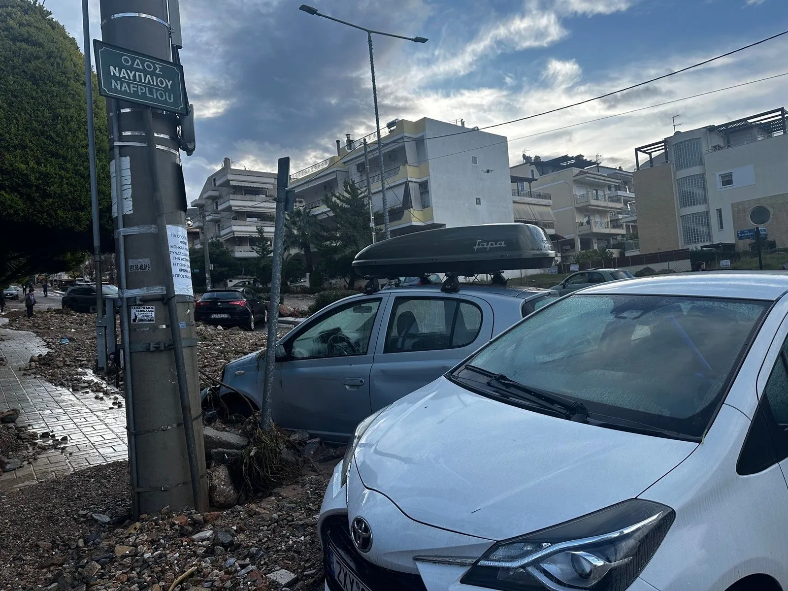 Σε αρκετές περιπτώσεις, χώματα, σκουπίδια και πέτρες έχουν συσσωρευτεί κάτω από σταθμευμένα αυτοκίνητα, με αποτέλεσμα ορισμένα να έχουν ακόμη και ανυψωθεί. Εν τω μεταξύ, ιδιοκτήτες των οχημάτων προσπαθούν ακόμα και με φτυάρια να “ξεθάψουν” τα αυτοκίνητά τους από τους όγκους φερτών υλικών που έχουν συσσωρευθεί γύρω από αυτά. Η περιοχή είναι πλημμυρισμένη από λάσπες, με την καθημερινότητα των κατοίκων να έχει παραλύσει.