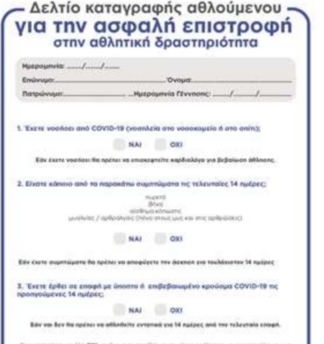 Χρήση των οργανωμένων ανοικτών αθλητικών εγκαταστάσεων μπορούν να κάνουν από σήμερα οι αθλούμενοι πολίτες. Για να γυμναστούν, όμως, απαραίτητη προϋπόθεση είναι η συμπλήρωση και επίδειξη του “Δελτίου καταγραφής αθλούμενου για την ασφαλή επιστροφή στην αθλητική δραστηριότητα”.