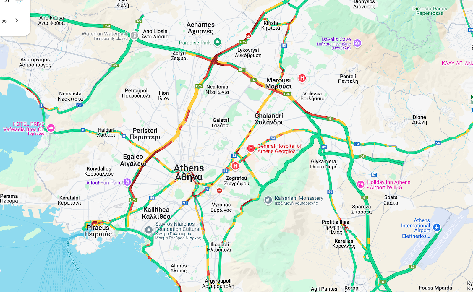“Στο κόκκινο” βρίσκονται ο Κηφισός, η Αττική Οδός, η παραλιακή στο ρεύμα προς Αθήνα στο ύψος του Αλίμου, αλλά και στον Σκαραμαγκά προς Χαϊδάρι.