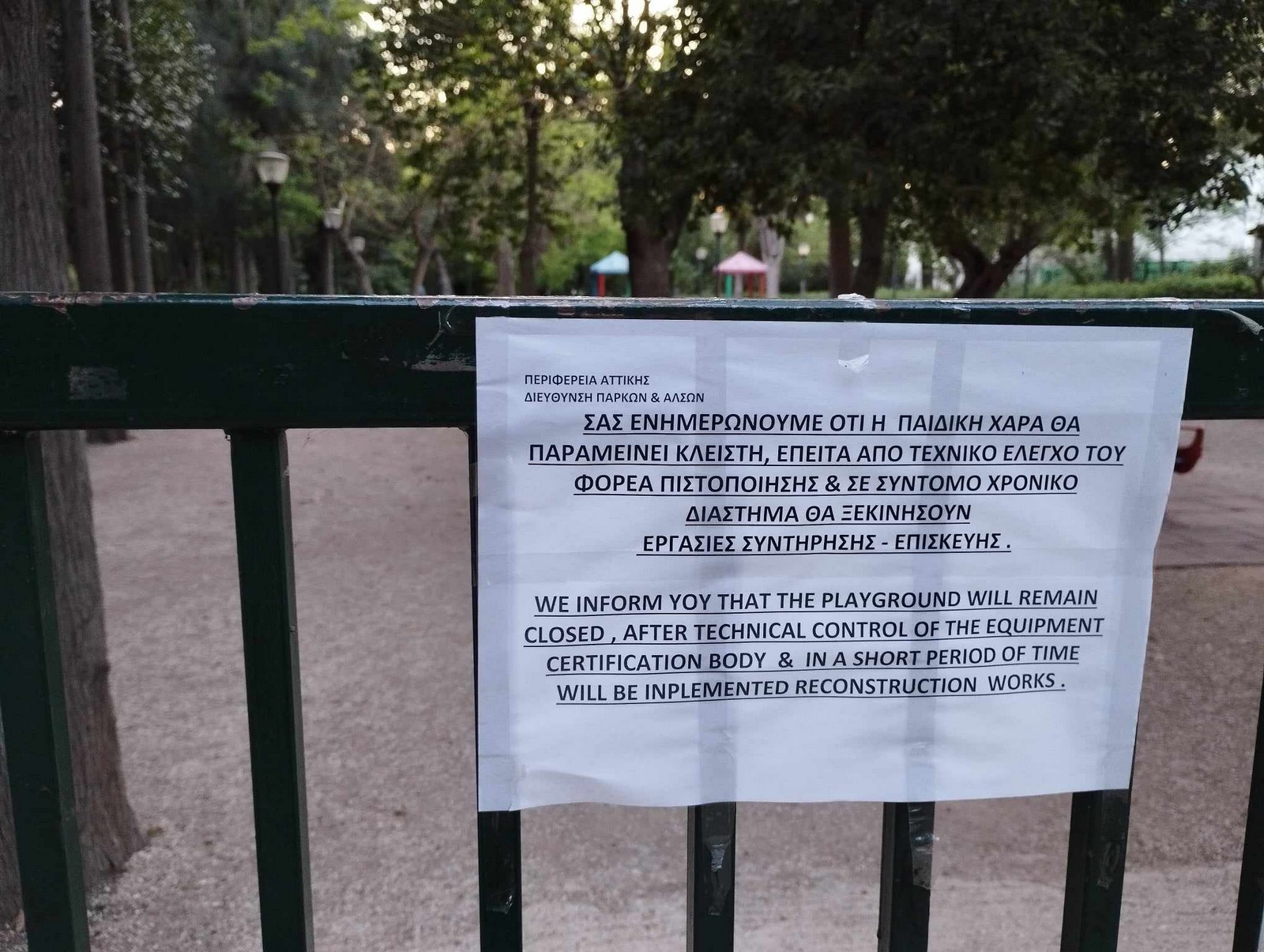 Μετά τις 12 παιδικές χαρές του Δήμου Αθηναίων, που οδηγήθηκαν σε κλείσιμο λόγω μη χορήγησης της απαραίτητης πιστοποίησης, την ίδια τύχη είχαν και οι πέντε παιδικές χαρές που βρίσκονται υπό την ευθύνη της Περιφέρειας Αττικής.