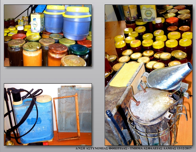 Σε νομότυπες έρευνες που πραγματοποιήθηκαν σε αγροικία που διατηρεί σε περιοχή του Μπράλου Φθιώτιδας και χρησιμοποιούσε ως «καβάτζα», καθώς και σε οικία που διατηρεί σε περιοχή της Χαλκίδας, βρέθηκαν μεταξύ άλλων και κατασχέθηκαν 95 δοχεία που περιείχαν συνολικά 203 κιλά και 750 γραμμάρια μέλι, χειροκίνητος μελιτοεξαγωγέας, δύο καρότσια μεταφοράς, δύο βασιλικά διαφράγματα κυψελών, κηρηθροφορέας κυψέλης, άνευ αριθμού, δύο καπνιστήρια μελισσών, ημιαυτόματος ψεκαστήρας πλάτης, ο οποίος είχε έντονη οσμή πετρελαίου και ασύρματος με τα παρελκόμενα του (φορτιστής – ακουστικά).