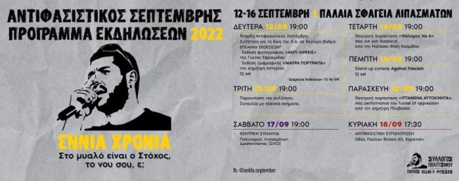 Κορυφώνονται το Σαββατοκύριακο, 17 και 18 Σεπτεμβρίου, οι εκδηλώσεις του «Αντιφασιστικού Σεπτέμβρη 2022» για τα 9 χρόνια από τη δολοφονία του Παύλου Φύσσα, που ξεκίνησαν τη Δευτέρα 12 Σεπτεμβρίου.