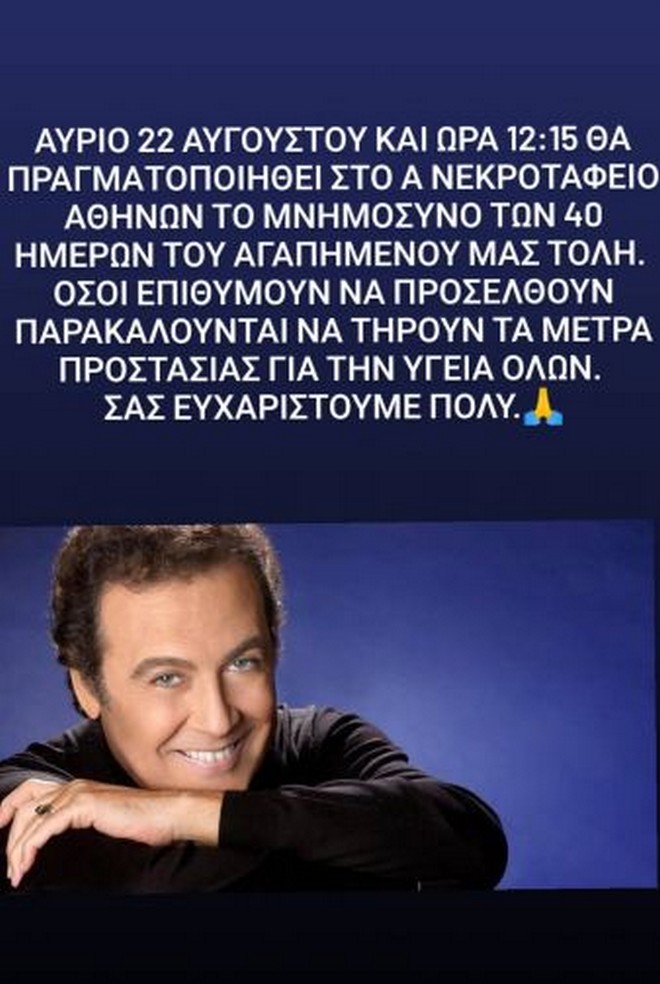 “Αύριο 22 Αυγούστου στις 12.15 θα πραγματοποιηθεί στο Α νεκροταφείο Αθηνών το μνημόσυνο των σαράντα ημερών του αγαπημένου μας Τόλη. Όσοι επιθυμούν να προσέλθουν παρακαλούνται να τηρούν τα μέτρα προστασίας για την υγεία όλων. Σας ευχαριστούμε πολύ”, έγραψε στο Instagram η Άντζελα Γκερέκου.
