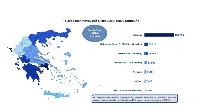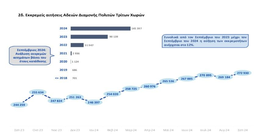 Οι αριθμοί αποκαλύπτουν μια σημαντική και επίμονη αύξηση στην εκκρεμότητα των αιτήσεων. Τα τελευταία στοιχεία από το Υπουργείο Μετανάστευσης και Ασύλου, δείχνουν ότι οι συνολικές, σε εκκρεμότητα, αιτήσεις για το Σεπτέμβριο του 2024 ανέρχονται σε 272.930, σημειώνοντας αύξηση της τάξης του 12% σε σύγκριση με την ίδια περίοδο το προηγούμενο έτος. Σε αυτό το πλαίσιο, διαφαίνεται η ανάγκη για ουσιαστικές παρεμβάσεις, με έμφαση στην ενίσχυση των αρμόδιων υπηρεσιών που ασχολούνται με τις άδειες διαμονής και στην επίλυση των ζητημάτων που δυσχεραίνουν την ταχεία εξέταση και διεκπεραίωση αυτών των αιτημάτων.
