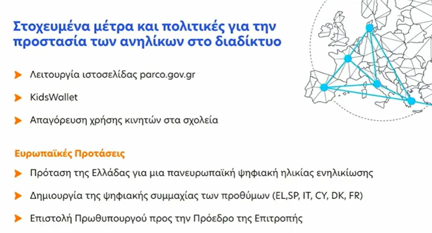 Στο πλαίσιο αυτό, ο κ. Σκέρτσος ανέφερε πως ο πρωθυπουργός Κυριάκος Μητσοτάκης, απέστειλε επιστολή στην Πρόεδρο της Κομισιόν για μια “ψηφιακή συμμαχία των προθύμων” ώστε να αποκτήσουμε ένα πιο αποτελεσματικό πλαίσιο για την προστασία ανηλίκων. Μεταξύ άλλων, στην πρόταση της χώρας είναι η θέσπιση μιας ευρωπαϊκής ψηφιακής ηλικίας ενηλικίωσης στα 15 έτη.