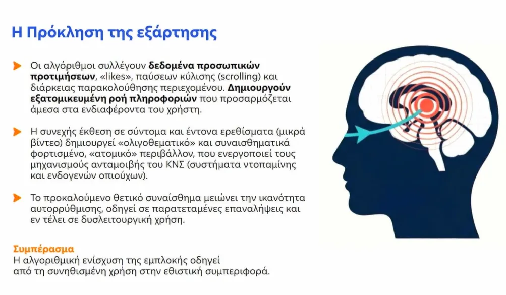 Ο κ. Σκέρτσος προχώρησε λέγοντας πως “ο τρόπος που λειτουργούν οι αλγόριθμοι και το μοντέλο σύγχρονης τεχνολογίας μπορεί να λειτουργήσει εθιστικά για άτομα που δεν έχουν ολοκληρώσει την ψυχοκοινωνική τους ανάπτυξη”.