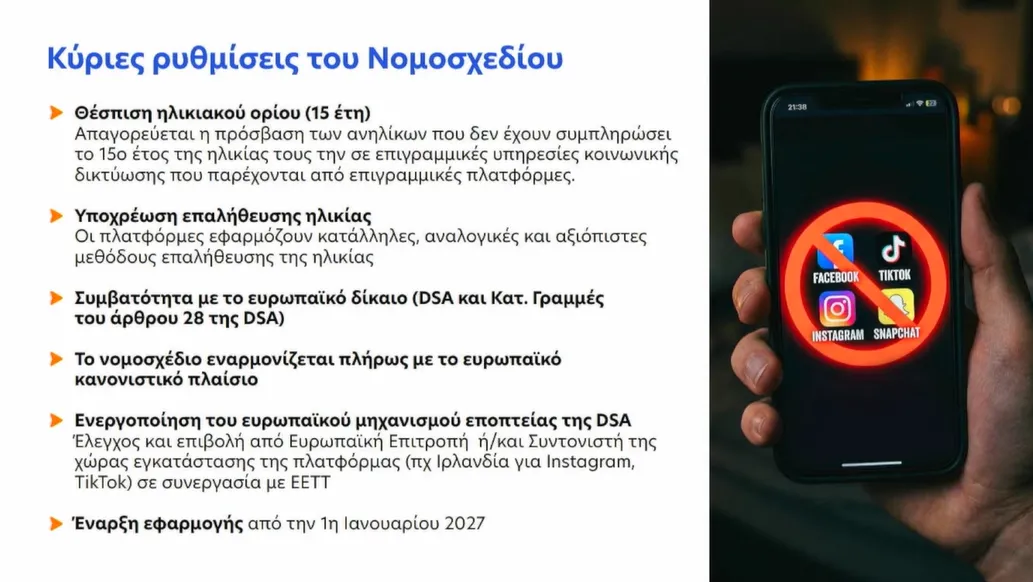 Συνέχισε λέγοντας πως το μέτρο μπαίνει σε εφαρμογή από την 1η Ιανουαρίου του 2027. Όπως σημείωσε, οι πλατφόρμες θα είναι υποχρεωμένες να ζητούν μεθόδους επαλήθευσης ηλικίας. Η απαγόρευση αφορά Instagram, TikTok, facebook, Snapchat, αλλά δεν περιλαμβάνει τις πλατφόρμες που χρησιμοποιούνται απλώς για την ανταλλαγή μηνυμάτων όπως το Viber και το Whatsapp, πράγμα που προκαλεί εύλογες απορίες.