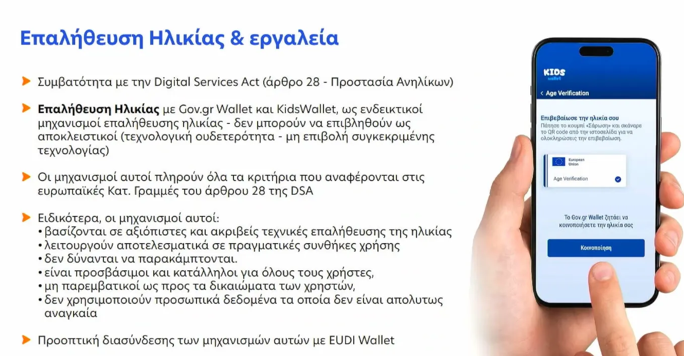 Ο κ. Παπαστεργίου τόνισε πως “είμαστε η πρώτη και μόνη χώρα που εφαρμόζουμε τον έλεγχο πώλησης αλκοόλ και καπνικών προϊόντων και η εφαρμογή του KidsWallet είναι ελληνική εφαρμογή για επαλήθευση ηλικίας. Ο μηχανισμός αυτός δεν δίνει προσωπικά δεδομένα παρά μόνο ταυτοποιεί αν ο χρήστης είναι άνω ή κάτω των 15 ετών”.
