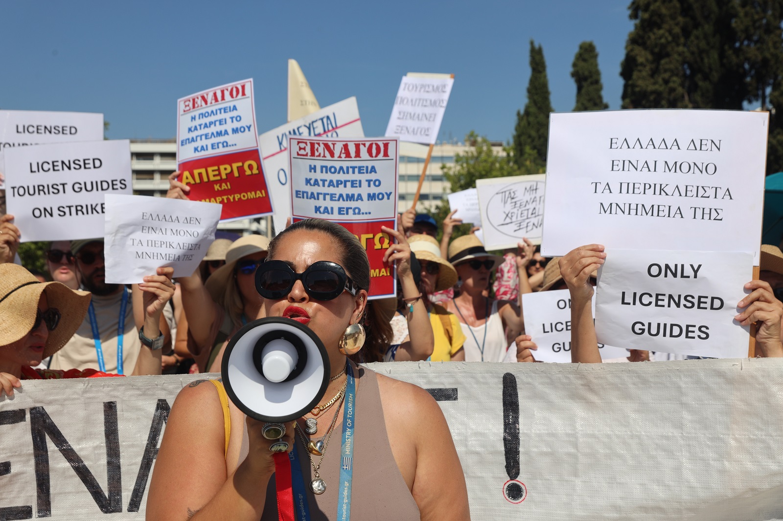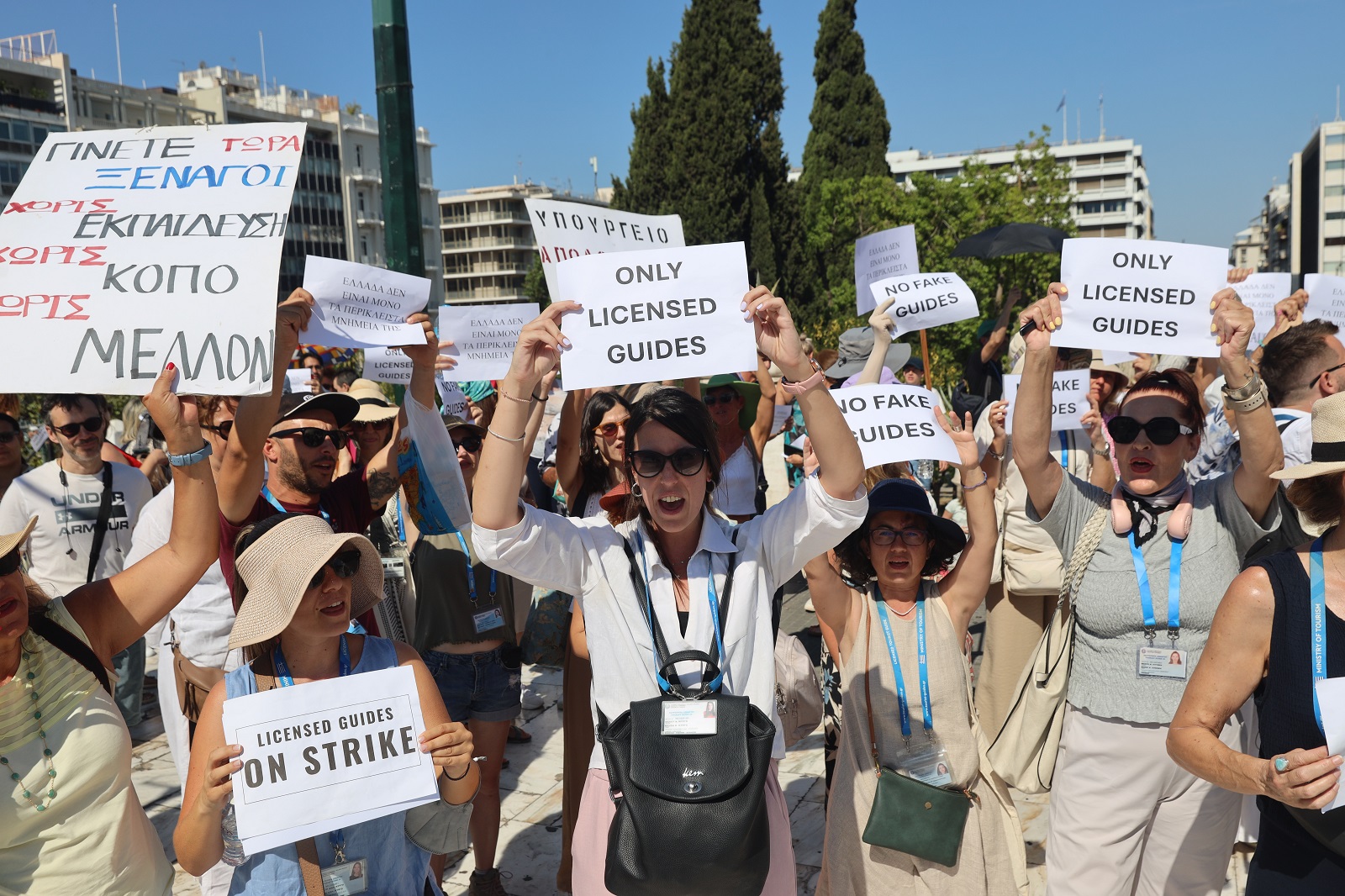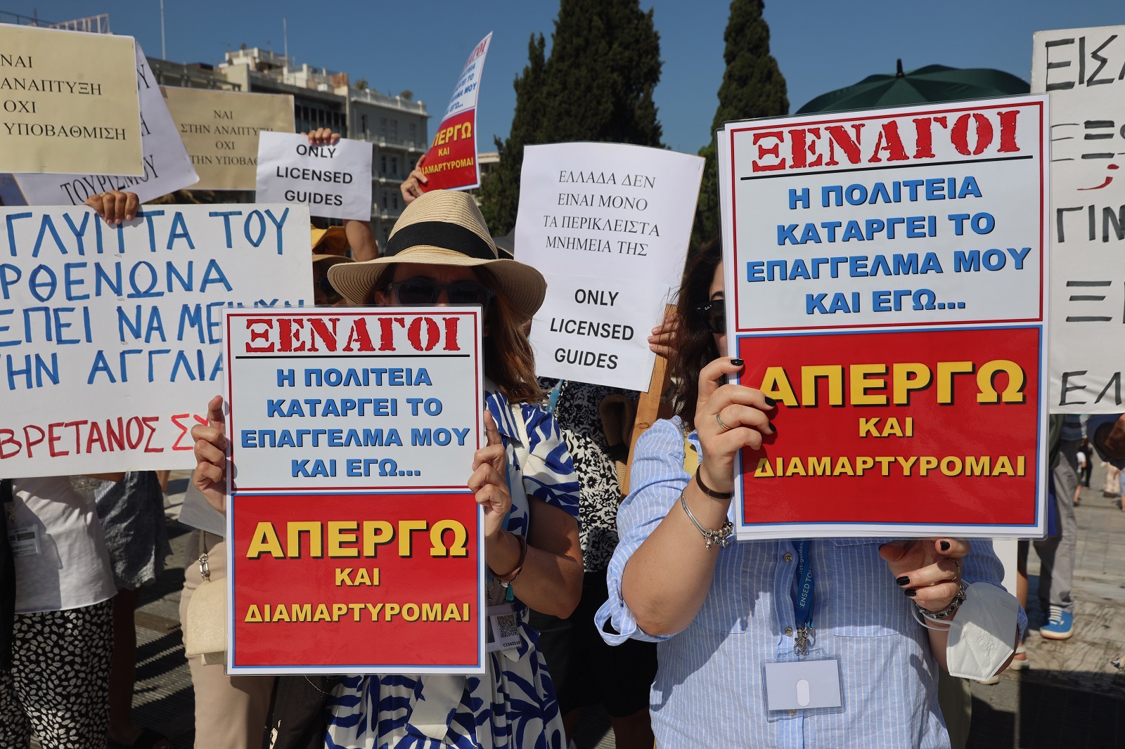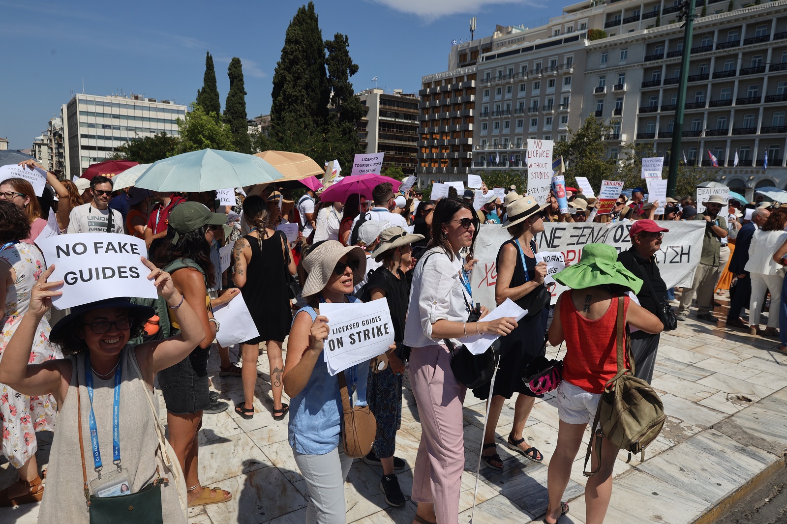 Οι ξεναγοί βρέθηκαν το πρωί της Πέμπτης και παρά τον καύσωνα στην πλατεία Συντάγματος, με πλακάτ και πανό.